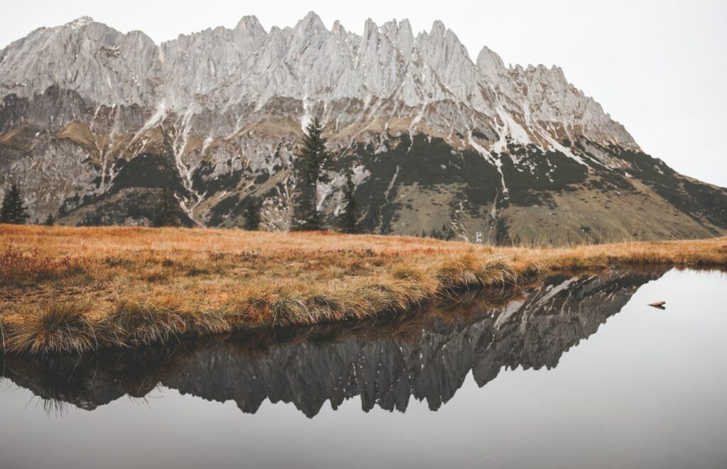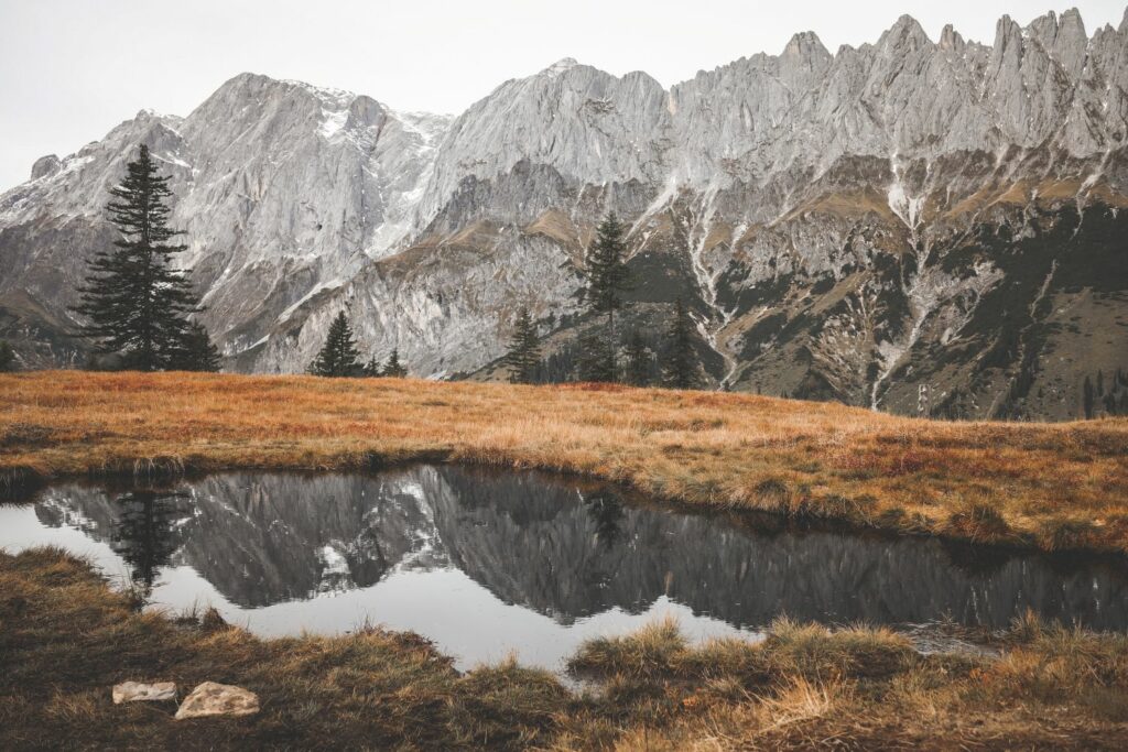 Nun ist es an der Zeit, den kleinen Abstecher zum Spiegelsee zu nehmen. Beschildert ist dieser nicht – und zugegeben, See ist vielleicht auch etwas übertrieben für dieses kleine Biotop, aber seinem Namen macht er alle Ehre – nirgendwo spiegeln sich die Spitzen des Hochkönigs so schön, wie auf seiner Wasseroberfläche. Weiter abwärts, zurück zum Parkplatz folgt ihr einfach der Beschilderung zum Arthurhaus.