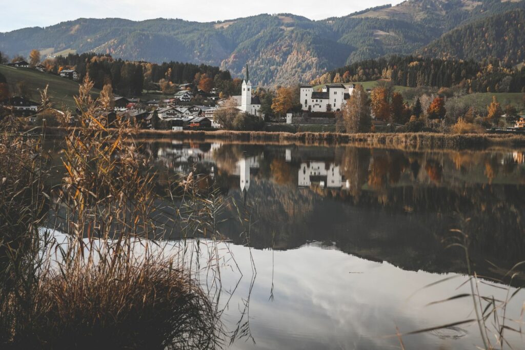 Rund 18 Kilometer entfernt von Bischofshofen liegt die Gemeinde Goldegg am See. Malerisch liegt der gleichnamige Moorsee abseits des Trubels – und lädt so zum entspannen und bei den richtigen Temperaturen zum baden ein.